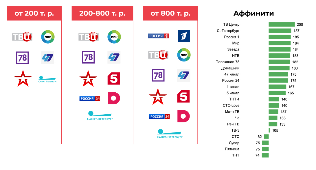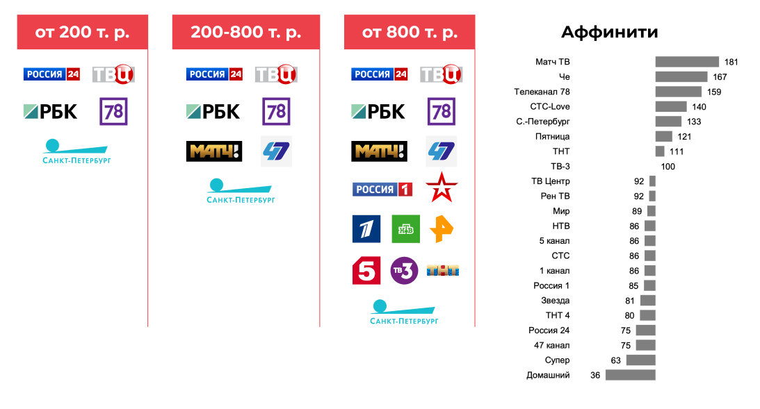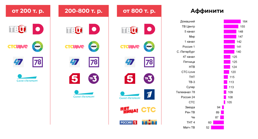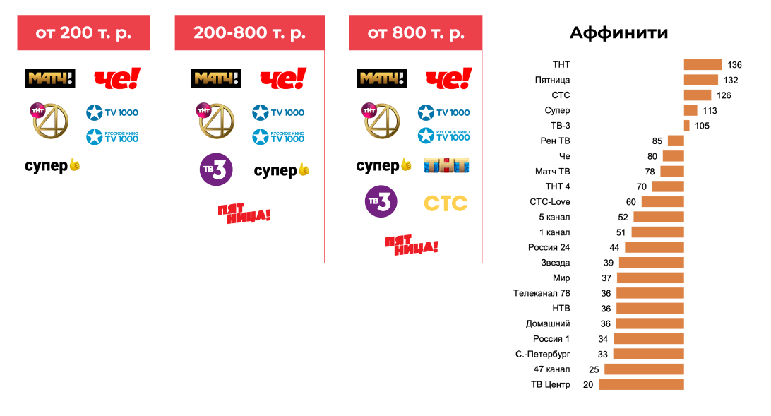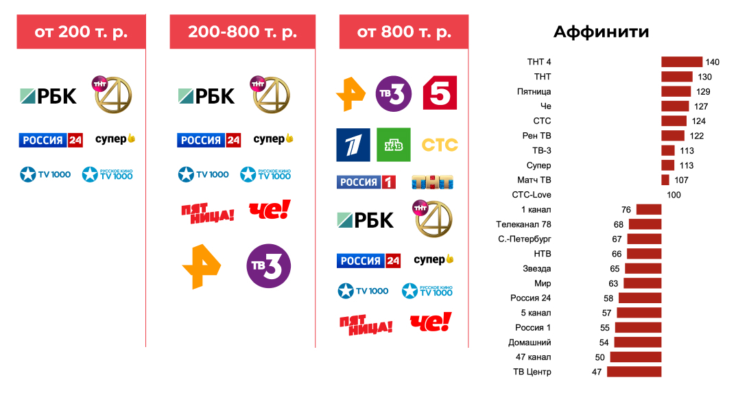 Affinity index - показывает, насколько более или менее характерен для данной целевой аудитории контакт с данным медиа, чем для всей генеральной совокупности в целом. Чем выше значение индекса (больше 100), тем в большей степени используемый медиа канал соответствует целевой аудитории, и значит рекламное сообщение будет более направленным.